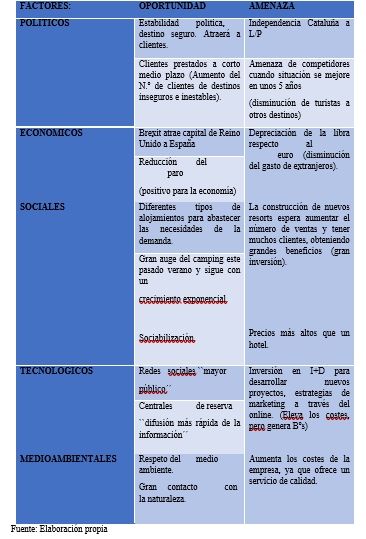 En cuanto a sus amenazas, el gasto de los turistas ha disminuido y Marjal, si es verdad que ofrece servicios de calidad, pero también está relacionado luego esto en el precio. Por lo que puede ser un factor negativo ya que algunos de los clientes no puedan gastarse este dinero en unas vacaciones. Por otro lado, en cuanto a empresas con servicios similares, cada vez más, las empresas desarrollan estrategias de crecimiento intentando superar a sus competidores, por lo que al ser el funcionamiento de las empresas así, le obliga a invertir, innovar y mejorar continuamente sus servicios.